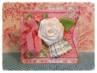 I love this card, I think it's so pretty. I hand made the yellow ribbon roses and added a pretty pink velvet bought flower and millenery flowers too. I also scrunched up some pink hand dyed seam binding ribbon that I think is very pretty on the card.